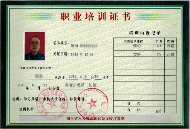 鍒濈駭銆佷腑綰у吇鑰佹姢鐞嗗憳璧勬牸璇佷功鏄箻娼競灝變笟鍩硅涓績棰佸彂鐨勮亴涓氬煿璁瘉涔︺?/span>
