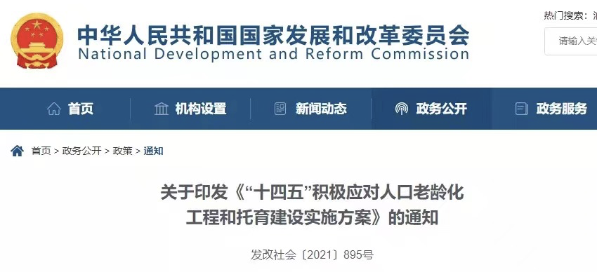 8月31日,國家發(fā)改委會同民政部、國家衛(wèi)健委設(shè)立了“十四五”積極應(yīng)對人口老齡化工程和托育建設(shè)專項,簡稱“一老一小”專項。