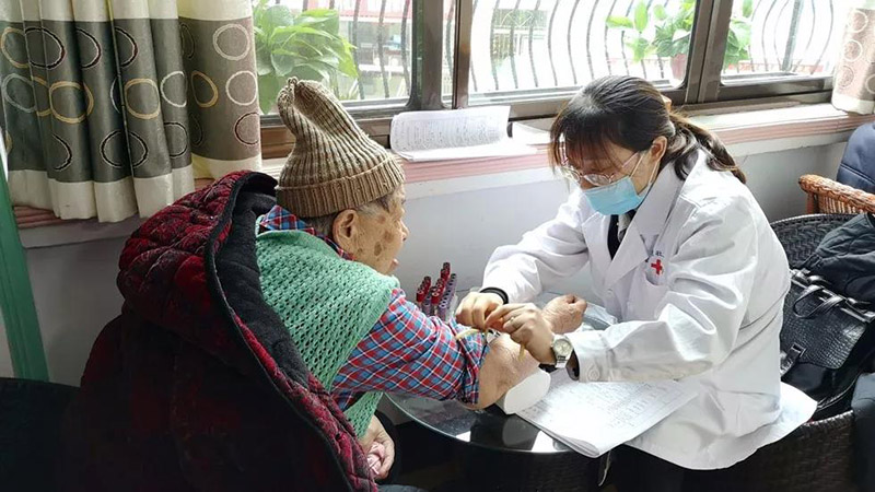 一邊耐心細(xì)致地為每一位老人進(jìn)行量血壓、稱體重、抽血、尿檢、B超、心電圖等各項(xiàng)檢測。