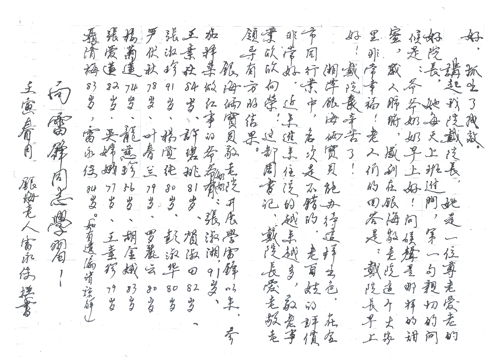 銀海老人學(xué)雷鋒做紅事是在周艷純書(shū)記和戴靜院長(zhǎng)親手抓起來(lái)的,抓得好,抓出了成效。