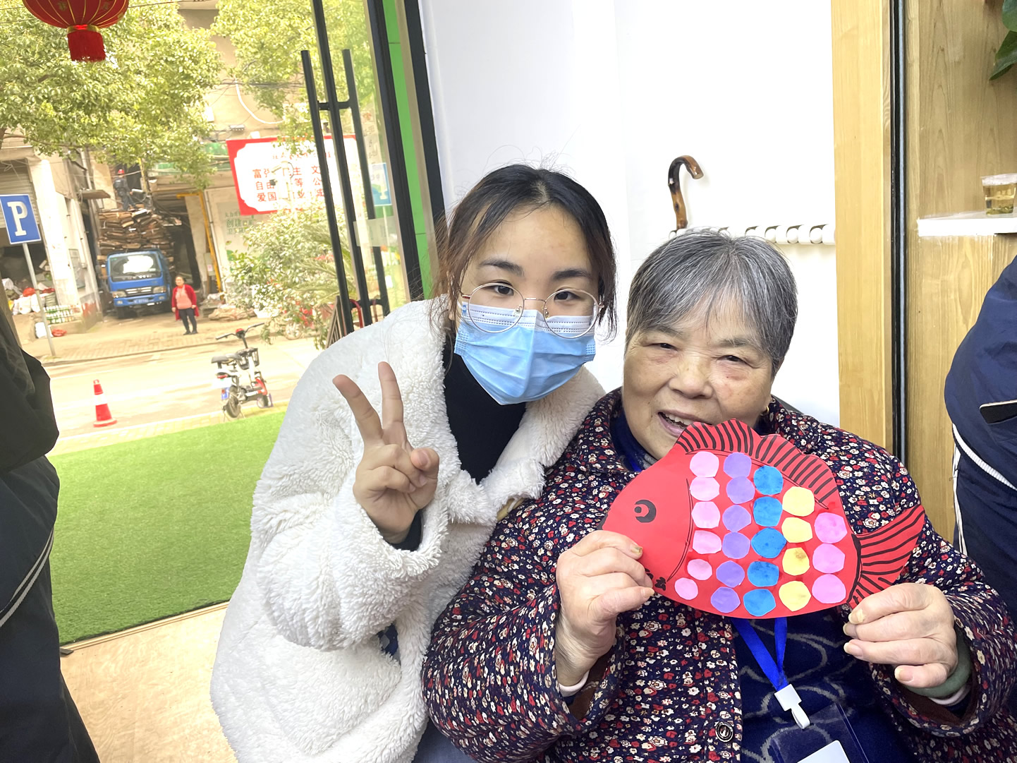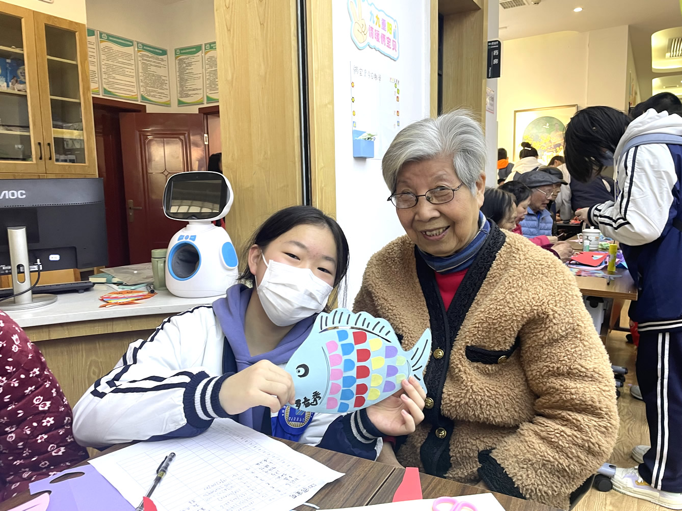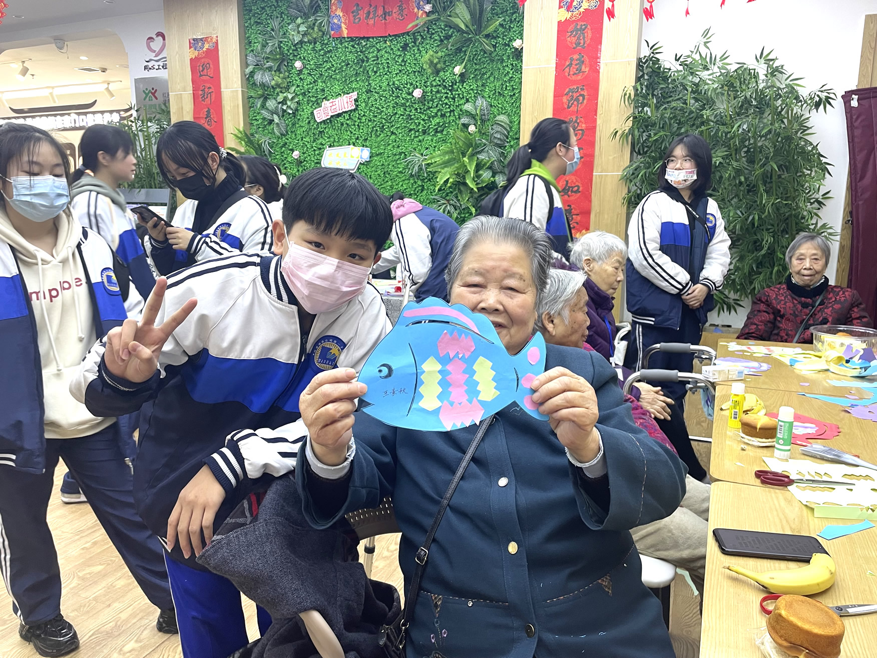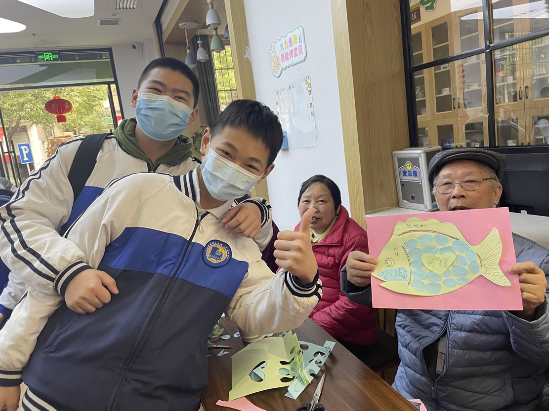 “爺爺奶奶們好!”還未瞧見人一聲聲清脆響亮的問好聲便已傳了進(jìn)來,在老師及工作人員的組織下同學(xué)們有序進(jìn)入到院內(nèi)并配合做好疫情防控登記。不一會兒,同學(xué)們陸續(xù)找到爺爺奶奶進(jìn)行自我介紹,并以一對一的形式來協(xié)助他們完成今天的手工作品“年年有魚”。