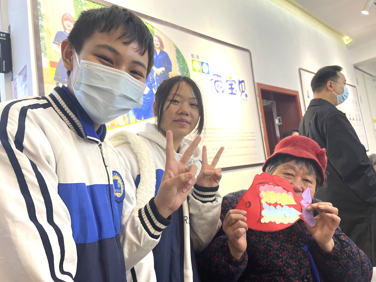 “爺爺,您喜歡這個顏色是嗎?下面我?guī)椭黄鸢阉舫鰜砗脝??”、“奶奶,您平常都有些什么愛好呀,可以跟我們說說您的故事嗎?”……只見同學(xué)們有的蹲坐在老人旁邊,有的則是伏耳于他們面前,耐心認(rèn)真地和爺爺奶奶們進(jìn)行交流,其他的人則是分工協(xié)作,完成“魚”的其他部位制作。不多久,一條條色彩斑斕,創(chuàng)意十足的“魚”就做好啦!爺爺奶奶們拿著完成的作品分別和自己的“小伙伴”們合影留念,再次感謝他們的到來!