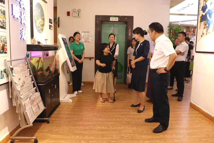 董事長王朝暉女士帶領(lǐng)導(dǎo)一行先后參觀了銀海倆寶貝窯灣康養(yǎng)中心的藥房、文化墻、多功能活動(dòng)室、各類助老設(shè)施、護(hù)士站、綜合養(yǎng)老服務(wù)平臺、年齡博物館、陽光花房等地。